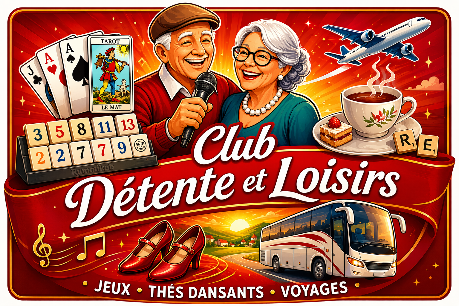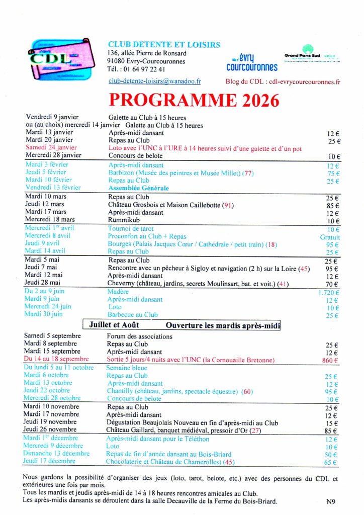 | Voir sur le Programme 2026 toutes les activités proposées par le Club Les Thés dansants sont réalisés dans la salle Decauville de la Ferme du Bois Briard Les Repas sont réalisés dans notre Club |